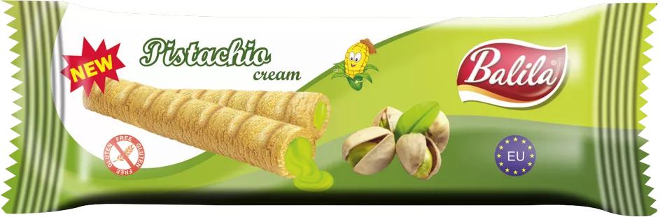 Delikatne i lekkie rurki z nadzieniem o smaku pistacjowym, zamkniętym w kukurydzianym wafelku. >>> Słodka przekąska BEZ GLUTENU